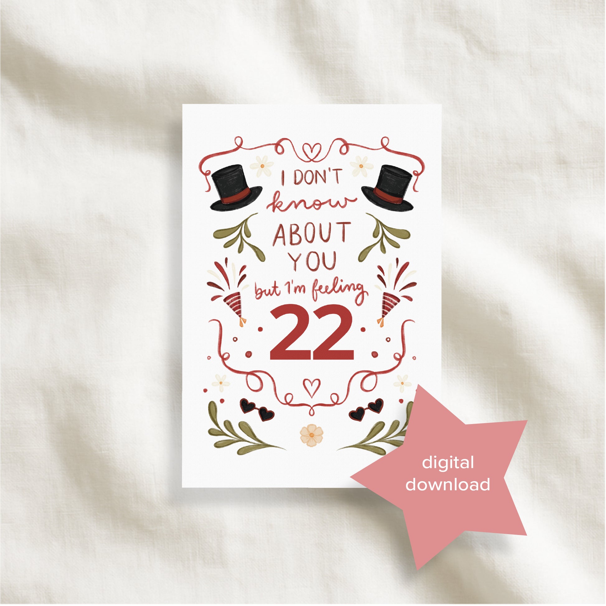 This printable birthday card is inspired by 22 (Taylor’s Version) and designed for fans who want to celebrate in Red Era style—wherever they are in the world. Whether you’re turning 22 or surprising your Swiftie bestie, this digital card brings the confetti, top hats, and heart-shaped sunglasses to life.