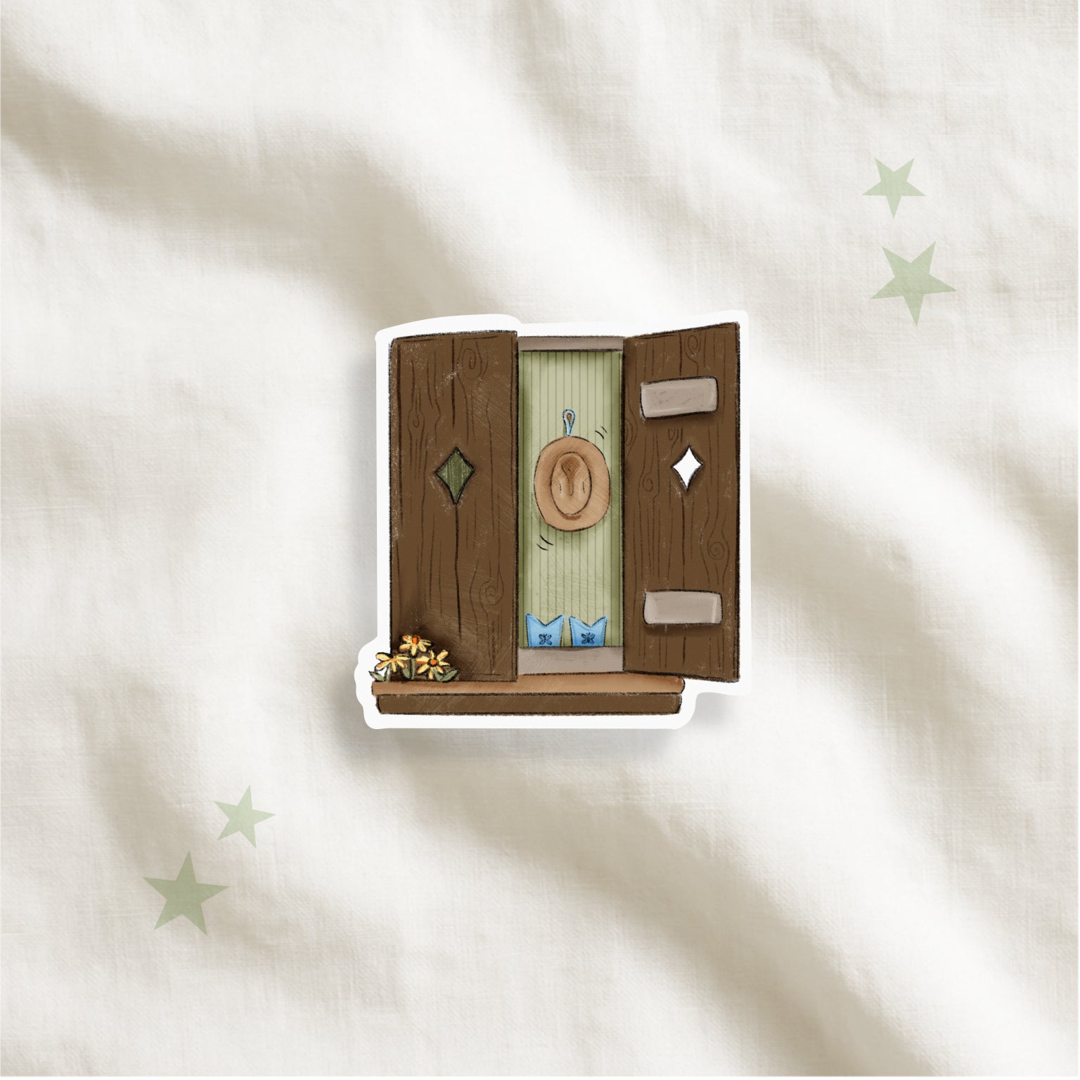 Open wooden shutters, cowboy boots, and hat gently hung on the wall.