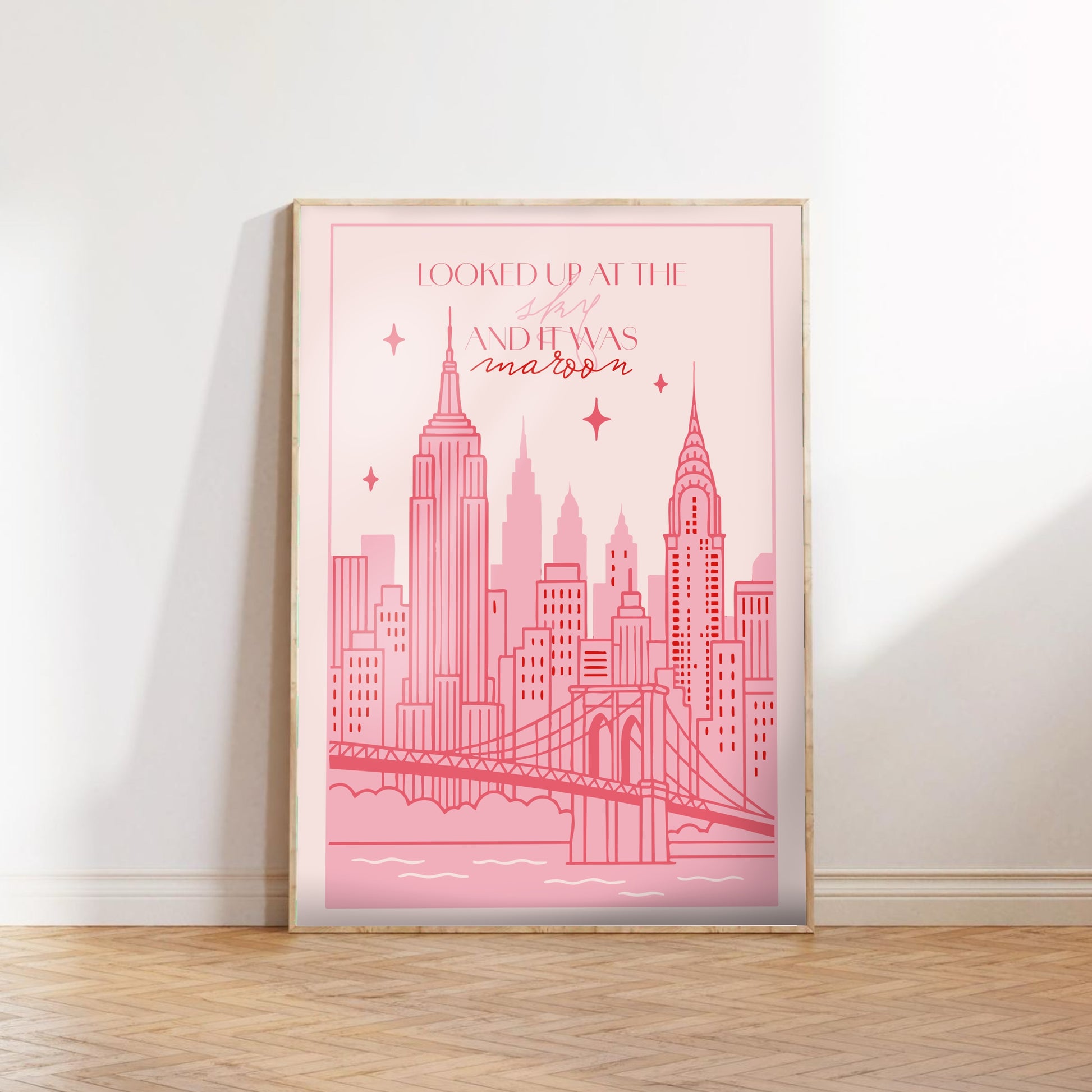 This Taylor Swift-inspired digital print brings the haunting beauty of Maroon to life with delicate city silhouettes, dreamy pink gradients, and starlit details. Featuring the line “Looked up at the sky and it was maroon,” this design is a love letter to a love that colored everything.