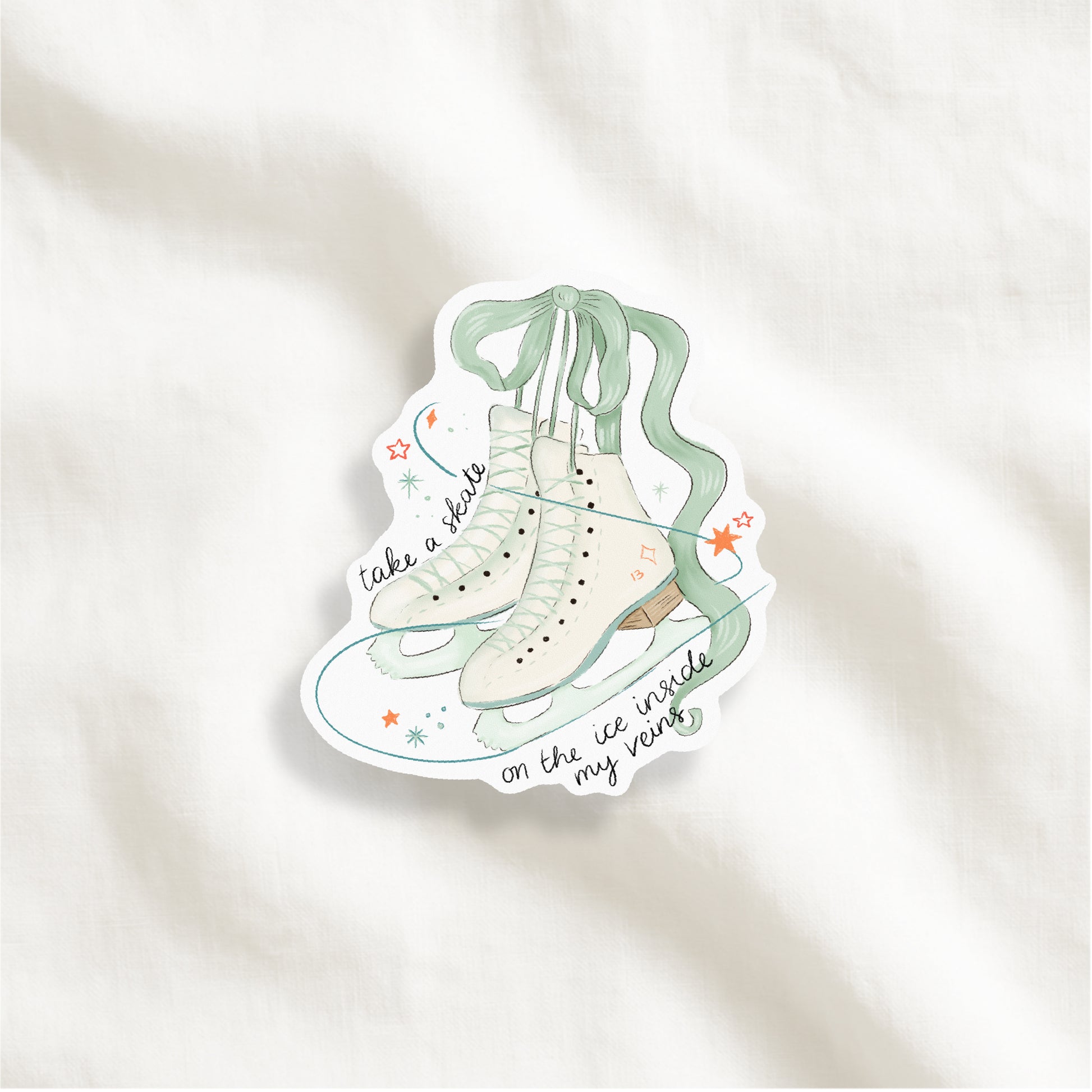 Featuring a pair of vintage-inspired ice skates, mint green ribbons and scattered stars.